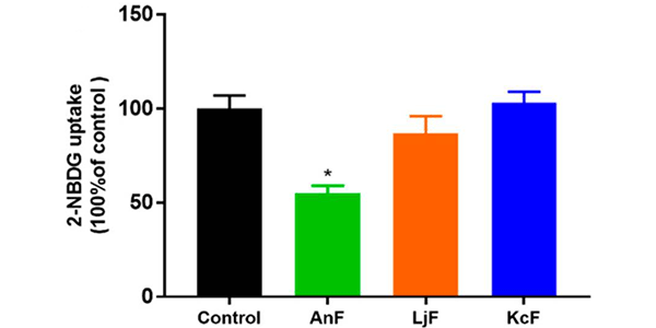 Caco-2 cells are treated with 100 μM 2‐NBDG for 30 min. Only 400 μg/mL of an AnF solution could significantly inhibit the transport of 2-NBDG in this Caco-2 monolayer cell model compared with the Control group, while the same concentration of LjF and KcF could not.