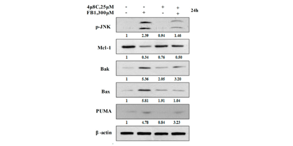The effect of the IRE1 specific inhibitor 4μ8C on the expression of apoptosis-related proteins. The cells are exposed to FB1 with or without 4μ8C for 24 h, and the phosphorylation of JNK, Mcl-1, Bak, Bax, and Puma were analyzed by Western blotting. n = 3.