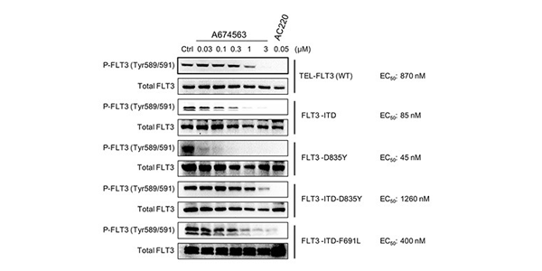 A674563 selectively inhibits FLT3-ITD. Inhibitory Effects of A674563 against auto-phosphorylation of FLT3 wt/mt kinases in the FLT3 wt/mt transformed BaF3 isogenic cell lines.