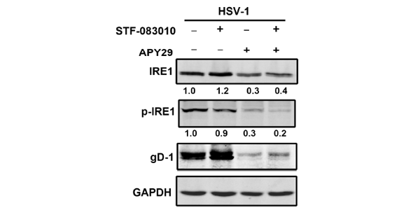 Inhibition of IRE1 kinase activity has an inhibitory effect on HSV-1 replication in HEC-1-A cells. Cells are presence or absence of APY29 or STF-083010 or both of two drugs and then infected with HSV-1 (HF). Total cellular cells lysates are prepared at 24 h p.i. and subject to Western blot analysis against.