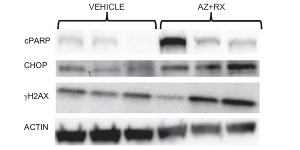 Tumor pieces from M130116 PDXs treated with the vehicle or the RVX2135/AZ20 combination treatment are subjected to western blot analysis.