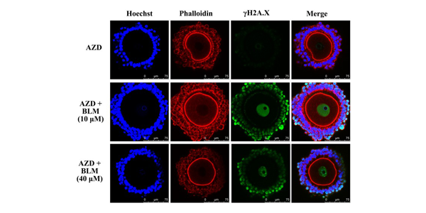 Inhibition of nuclear actin filament formation by Chek1/2 inhibitor, AZD7762 (AZD). No nuclear actin filament formation is observed upon treatment of CEOs with AZD alone.