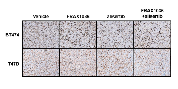 Alisertib and combination treatment suppress proliferation in BT474 orthotopic tumors as shown by decrease in Ki-67, which is statistically significantly different between vehicle and combination treatment, FRAX1036 and Alisertib, and FRAX1036 and combination treatment.