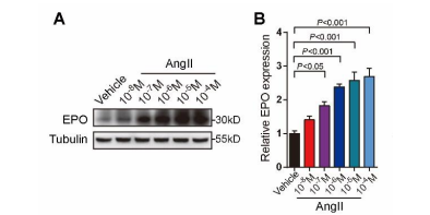 SMC was stimulated with vehicle and AngII of 10-8 M, 10-7 M, 10-6 M,10-5 M and 10-4 M, respectively, for 24 hrs. Cells were harvested and EPO protein abundance measured by Western blot.