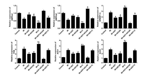 AMP-activated protein kinase activation by AST inhibits the expression of sterol regulatory element binding protein-1c (SREBP-1c) and SREBP-1c related genes. AST promotes AMPKa1 mRNA expression, AMPKa2 mRNA expression, and suppresses the expression of SREBP-1c, and its downstream genes FAS, ACC1, and also AMPK downstream gene SCD1.