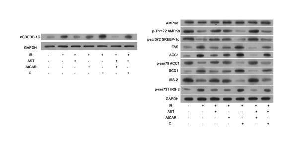 AMP-activated protein kinase (AMPK) activation by AST blunts dysfunction of lipid metabolism and insulin resistance in HepG2 cells. Representative bands of SREBP-1c nuclear protein and cytoplasmic proteins are visualized in the immunoblotting assay.