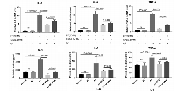 PCR and ELISA results show the mRNA and protein levels of IL-6, IL-8, and TNF-α after blocking Nrf2 activity. Brusatol (BT) pretreatment partially reverses IL-6, TNF-α, and IL-8 expression levels, which are inhibited by PAE in infected HCECs.