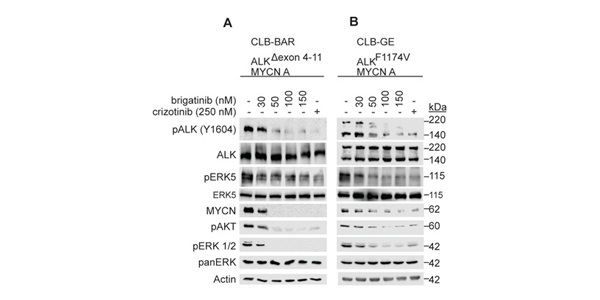 A, B. CLB-BAR (ALK-Δ4-11) and CLB-GE (ALK-F1174V), both ALK addicted cell lines, are treated with increasing doses of Brigatinib for 6 hours. Crizotinib (250 nM) is employed as a positive control. Cells lysates are resolved on SDS/PAGE followed by immunoblotting for pALK (Y1604) and additional downstream targets as indicated.