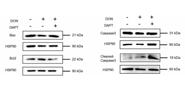 DAPT treatment enhances the protein expression of Bax and decreases the expression of Bcl2. And the expression of cleaved-caspase3 is upregulated after DAPT treatment (10 μM; for 24 h).