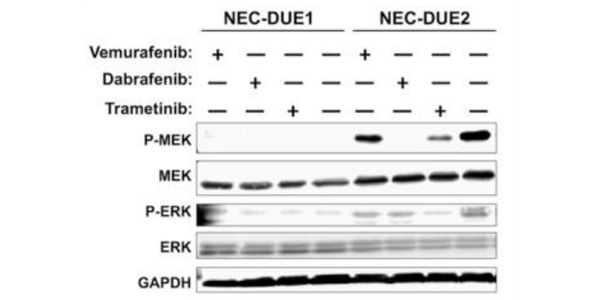Western blot confirmed increased MAPK pathway activity in NEC-DUE2 cells when compared to NECDUE1. Treatment with PLX4032 (1 μM), Dabrafenib (100 nM), or GSK1120212 (100 nM) for 4 hours leads to decreased MAPK signaling in NEC-DUE2 cells. Lysates are immunoblotted for the proteins indicated.