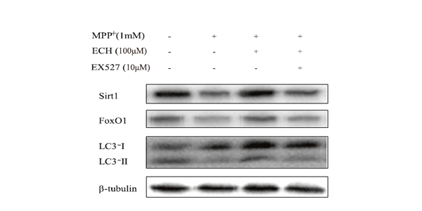 Western analysis of the protein expression of Sirt1, FoxO1 and LC3 protein in the PC12 with the treatment of MPP+, ECH and EX527.