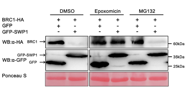 Destabilization of BRC1 mediated by SWP1 is inhibited by proteasome inhibitors Epoxomicin and MG132.