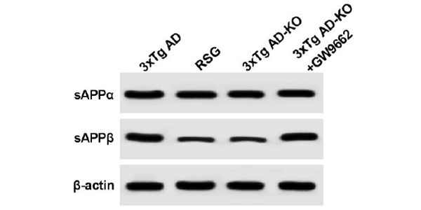 Protein levels of sAPPα and sAPPβ are measured by western blot assay in cerebral cortex of 12-month-old AD mice with different treatments (RSG and GW9662).