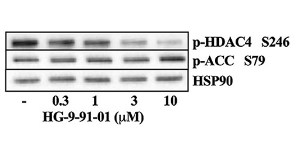 在无细胞实验中,HG-9-91-01 对抗 SIK 的效力比 AMPK (IC50=4.5 μM) 高 100 倍以上。HG-9-91-01 处理以剂量依赖性方式增加了 Pck1G6pcmRNA 表达,并且在用 4 μM HG-9-91-01 处理的细胞中也观察到了类似的效果。与此观察结果一致的是,HG-9-91-01 处理后,葡萄糖生成也呈剂量依赖性增加[3]