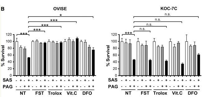 L-Ascorbic acid (Vitamin C) (250 μM, 1 h) significantly alleviates the growth suppression induced by combined SAS and PAG treatment only in OVISE cells, but shows no effect in KOC-7C cells.