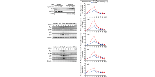 MT-1 cells are treated with Kynurenine (10, 50 μM) for 48 h or 4 days , then subjected to analyze the level of cytosolic AHR and nuclear AHR by immunoblot. After 4-days treatment, Kynurenine (10, 50 μM) remarkably induces the expression of CYP1A1 and plus-strand genes in a dose-dependent manner. Both groups efficiently triggered the production of Tax protein, p19 and p24, although the accumulation of gp46 is no apparent.