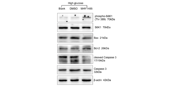 MHY1485 prevents high glucose-caused reduced phospho-S6K1 (Thr 389) and cell apoptosis in RSC96 cells.