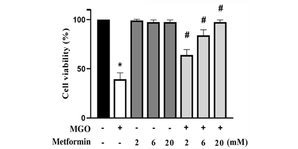 Metformin hydrochloride (Metformin; 2, 6, 20 mM; 30 min) attenuates MGO-induced cell death in a concentration-dependent manner in ARPE-19 cells.