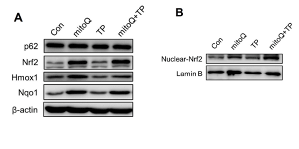 Mitoquinone mesylate activates p62-Nrf2 signaling pathway in TP-treated H9c2 cells. H9c2 cells pretreates with 500 nM Mitoquinone mesylate for 4 h are exposed to 80 nM TP for 24 h.