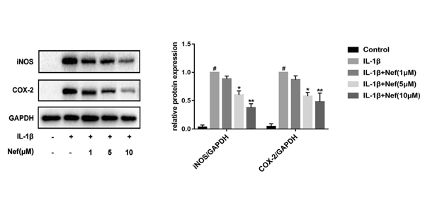 Nef inhibits excess expression of COX-2 and iNOS in IL-1β-treated rat chondrocytes. Western blotting results of iNOS and COX-2.