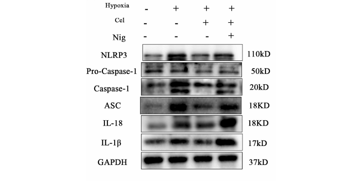 Nigericin (10 μM; 24 h) significantly upregulated the protein expression of NLRP3, Caspase-1, ASC, IL-1β, and IL-18 in hypoxia-treated H9c2 cells, reversing the inhibitory effects of Celastrol.