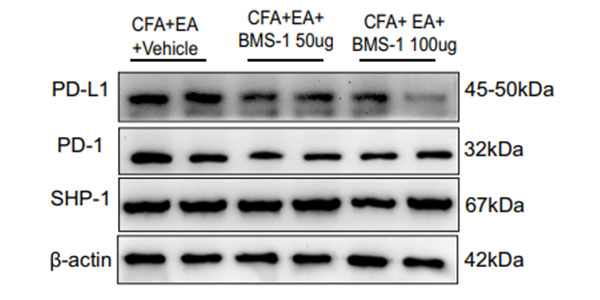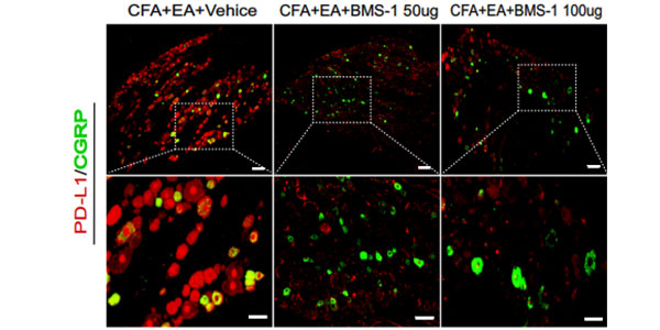 BMS-1 (50, 100 µg; Intrathecal injection; once every 2 days, for a total of four times) signifcantly reduces the expression of PD-L1 in CGRP+, neurons of Male Sprague-Dawley (SD) rats.