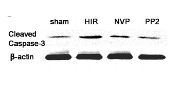 PP2 and NVP-AAM077 pretreatment decreases the expression level of Cleaved Caspase-3 significantly.