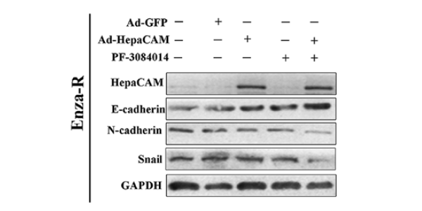 The expression of E-cadherin, N-cadherin and Snail in Enza-R cells is examined by western blot analysis. The cells are transfected with Ad-GFP or Ad-HepaCAM for 72 h and treated with 5 μM PF-3084014 for 48 h. GAPDH served as a loading control.