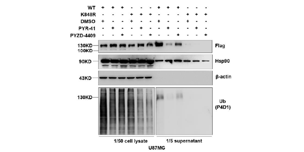 Western blotting assays demonstrate that treatment of 20 μM PYR-41 or 20 μM PYZD-4409 inhibits ubiquitination and CD133 secretion. Hsp90 and β-actin are used as loading controls.