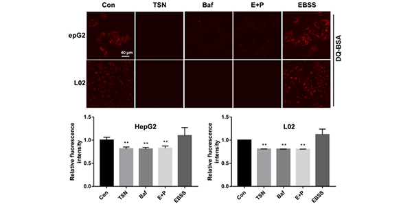 TSN (10 μM), Baf (0.5 μM), and E64D (25 μM) plus pepstatin A (50 μM; E + P ) treatment significantly inhibits the degradation ability of lysosomes (in HepG2 cells and L02 cells; medium for 6 h).