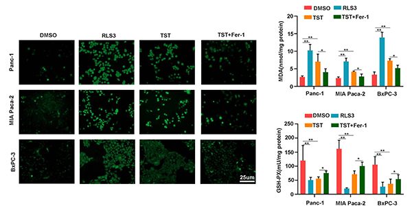 ROS levels are detected in pancreatic cancer cells from different treatment groups with a ROS Assay Kit. MDA and GSH-PX levels are detected in RSL3 (3 μM; 24 h) of treated Panc-1, MIA PaCa-2, and BxPC-3 cells.