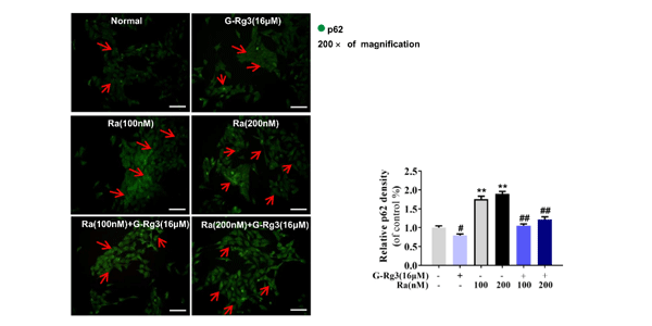 Immunofluorescence staining of p62 is conducted in HSC-T6 cells. G-Rg3 pretreatment with 16 μM and Ra are conducted with 100 or 200 nM.