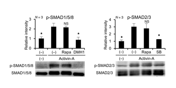 Phosphorylation of SMAD1/5/8 and SMAD2/3 in FOP-iMSCs. Serum-starved FOP-iMSCs are pretreated with 10 nM Rapamycin (Rapa), 1 μM DMH1, or 1 μM SB-431542 for 1 hour.