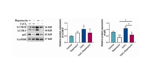 Rapamycin (50 nM; 24 h) partially reverses the cobalt-induced increase in LC3B-II and p62 levels in H4 cells.