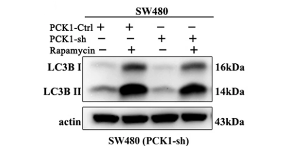 Rapamycin (2.5 mM; 24 h) ignificantly reverses the PCK1-sh-induced decreased expression of LC3B-II in SW480-sh cells.