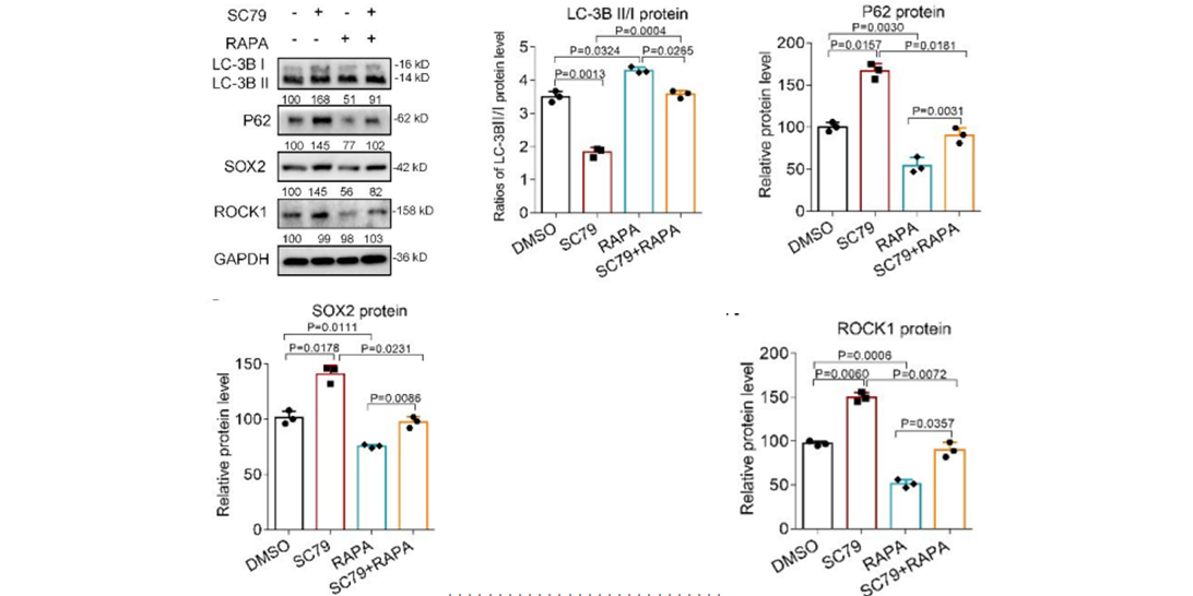 The relative protein levels of LC-3BII/Ⅰ(ratios), P62, SOX2, and ROCK1 in Swan 71 cells treated with SC79, Rapamycin (RAPA), or SC79+RAPA.