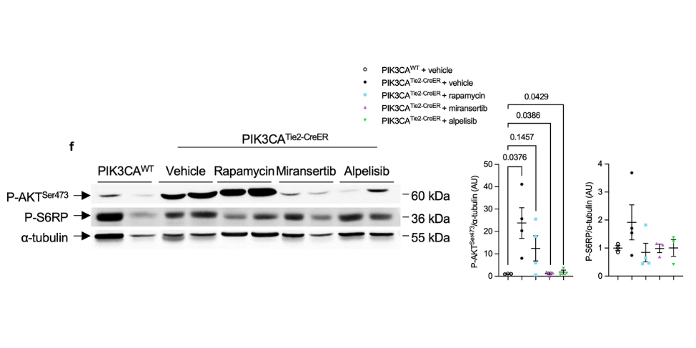 Rapamycin (4 -30 mg/kg; p.o.). Western blot and quantification of P-AKTSer473 and P-S6RP of the skin of PIK3CAWT and PIK3CATie2-CreER mice treated with either vehicle, rapamycin, miransertib or alpelisib (n = 3–4 per group).