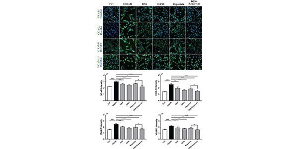 In HL-1 cells, when DSS and Reparixin (100nM) are applied in combination, the high expression levels of NF-κB, COX-2, ICAM-1 and VCAM-1 induced by OGD/R are further inhibited compared with that of DSS alone.