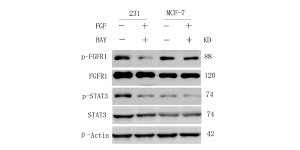 Effects of BAY1163877 on the Expression of p-FGFR1/FGFR1 and p-STAT3/STAT3 Protein in Breast Cancer Cell Lines MDA-MB-231 and MCF-7 are showed.