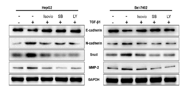 E-cadherin, N-cadherin, Snail, and MMP-2 expression in HCC cells is examined by Western blot analysis. GAPDH is used as a loading control.