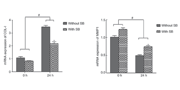 Effects of the TGF‑β1 inhibitor SB (20 μM) on mechanical force‑induced COL‑1 and MMP‑1 mRNA expression.