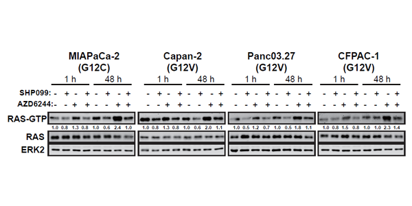 Immunoblots of whole cell lysates or GST-RBD-precipitated (RAS-GTP, KRASGTP and NRAS-GTP) lysates from PDAC cells treated with DMSO, SHP099 10 μM, AZD6244 1 μM, or both drugs for the times indicated.