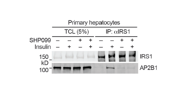 SHP099 inhibits IRS1-AP2 interaction in primary hepatocytes.