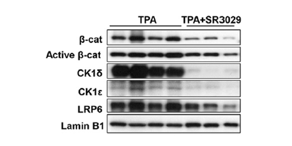 SR3029 suppresses TPA-induced skin tumor formation in vivo via blockade of Wnt/β-catenin signaling in mouse skin two-stage chemical carcinogenesis. Fifteen mice per group are initiated with DMBA, followed by repetitive applications of TPA alone or together with SR3029 in acetone twice a week for 18 wk. Expression levels of β-catenin, active β-catenin, CK1ε, CK1δ, and LRP6 in tumor samples are visualized after immunoblotting.