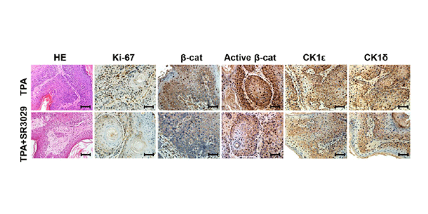 SR3029 suppresses TPA-induced skin tumor formation in vivo via blockade of Wnt/β-catenin signaling in mouse skin two-stage chemical carcinogenesis. Fifteen mice per group are initiated with DMBA, followed by repetitive applications of TPA alone or together with SR3029 in acetone twice a week for 18 wk. Hematoxylin/eosin staining and immunohistochemistry staining using antibodies specific for Ki-67, β-catenin, active β-catenin, CK1ε, and CK1δ.