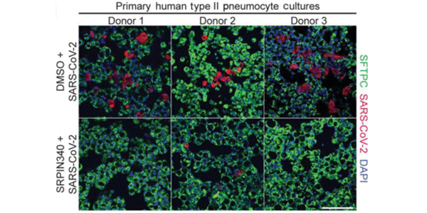 Representative primary human type II pneumocyte culture images from samples that are pretreated with SRPIN340 (53 μM; 12 h) before they are infected with SARS-CoV-2. 24 hours later, the cells are fixed and stained for SARS-CoV-2, DNA with DAPI, and surfactant protein C (SFTPC). Scale bar, 100 μm.