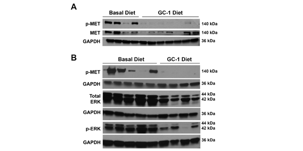 GC-1 treatment of hMet-mutant-β-catenin mice for 21-days leads to marked inhibition of Met signaling. A. A profound decrease in p-Met (Y1234/Y1235) is observed by WB analysis using whole liver lysates from GC-1 treated mice versus basal diet controls. A marginal but variable decrease in total Met was also evident in this group. GAPDH shows comparable loading. B. Another representative WB shows lack of p-Met (Y1234/1235) along with a dramatic decrease in downstream p-ERK1 (T202) and p-ERK2 (Y204)