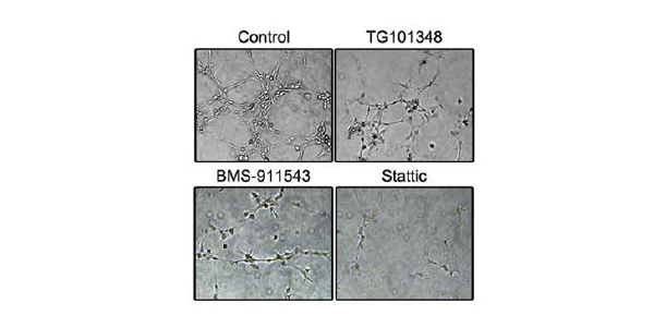 A549 cells are treated with TG101348 (3 nM), BMS-911543 (1.5 nM), and Stattic (2.5 lM) for 24 h, and the conditioned media are collected and applied for tube formation assay in HUVECs.