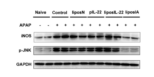 LiposIA inhibits ROS generation and prevents APAP-induced mitochondrial dysfunction in the liver. Immunoblot images of iNOS and p-JNK.
