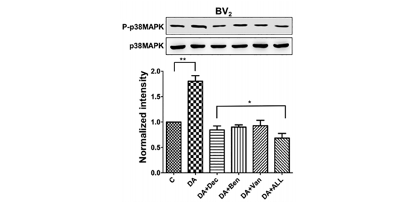 p38MAPK activation by dopamine (DA) can be inhibited by selective DAT blockers (Benztropine and Vanoxerine; 2 μM each) and PMAT blocker (Decynium; 2 μM). Combination of DAT and PMAT blockers further inhibits the activation of p38MAPK.